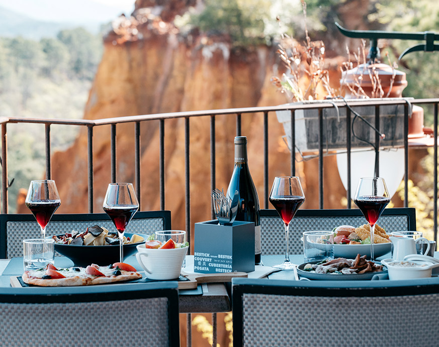 Cuisine provençale simple et conviviale avec une terrasse face aux falaises d’ocre, parfaite pour une pause gourmande avec une vue à couper le souffle.